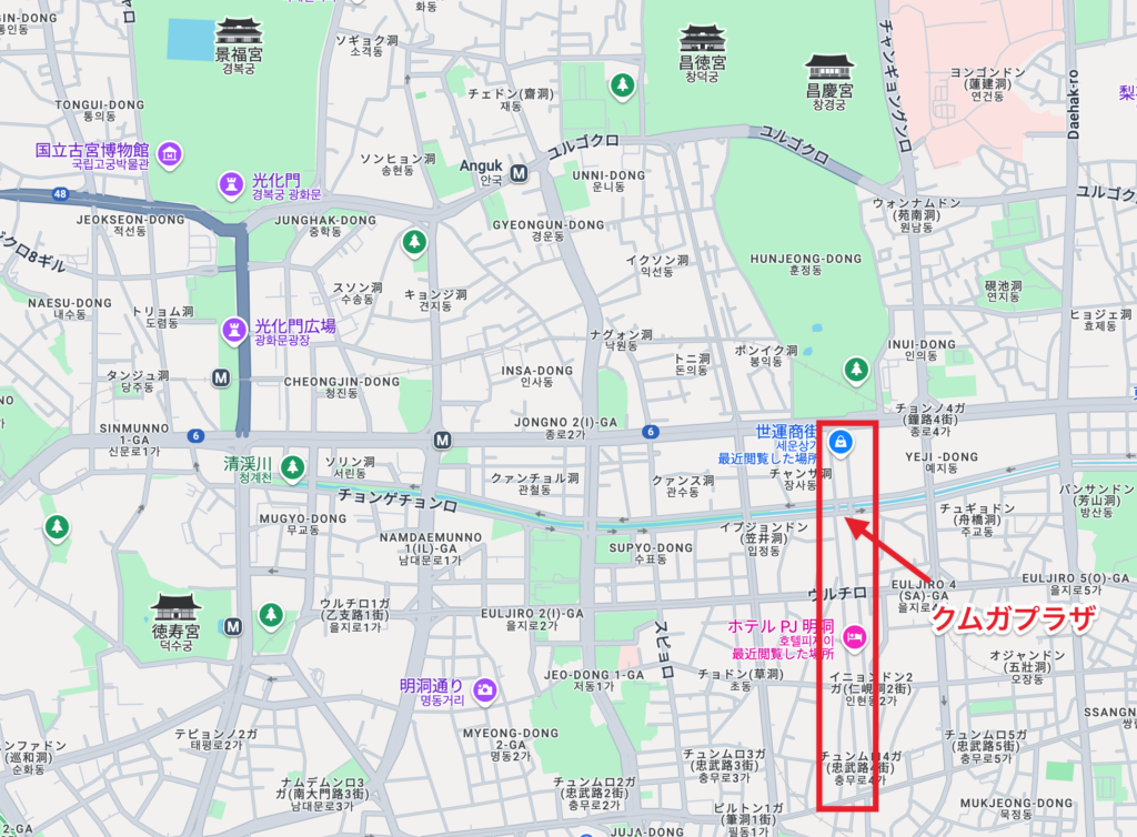 クムガプラザとして使われたビルは、上図の矢印のところ、清渓川に面した場所にあって、世運商街が一番名が通っているので、世運商街と紹介していますが、実際は清渓商街にあたります。